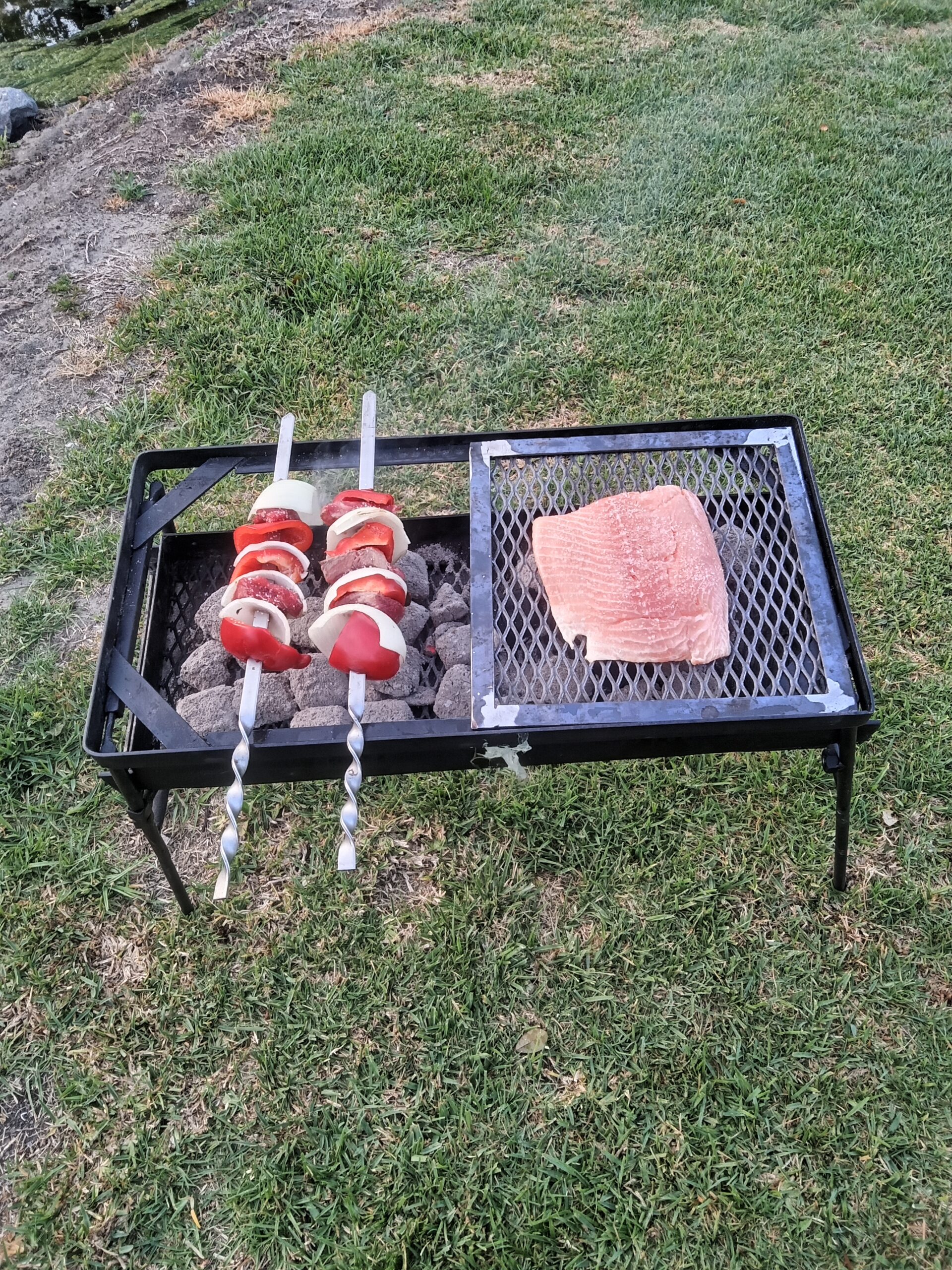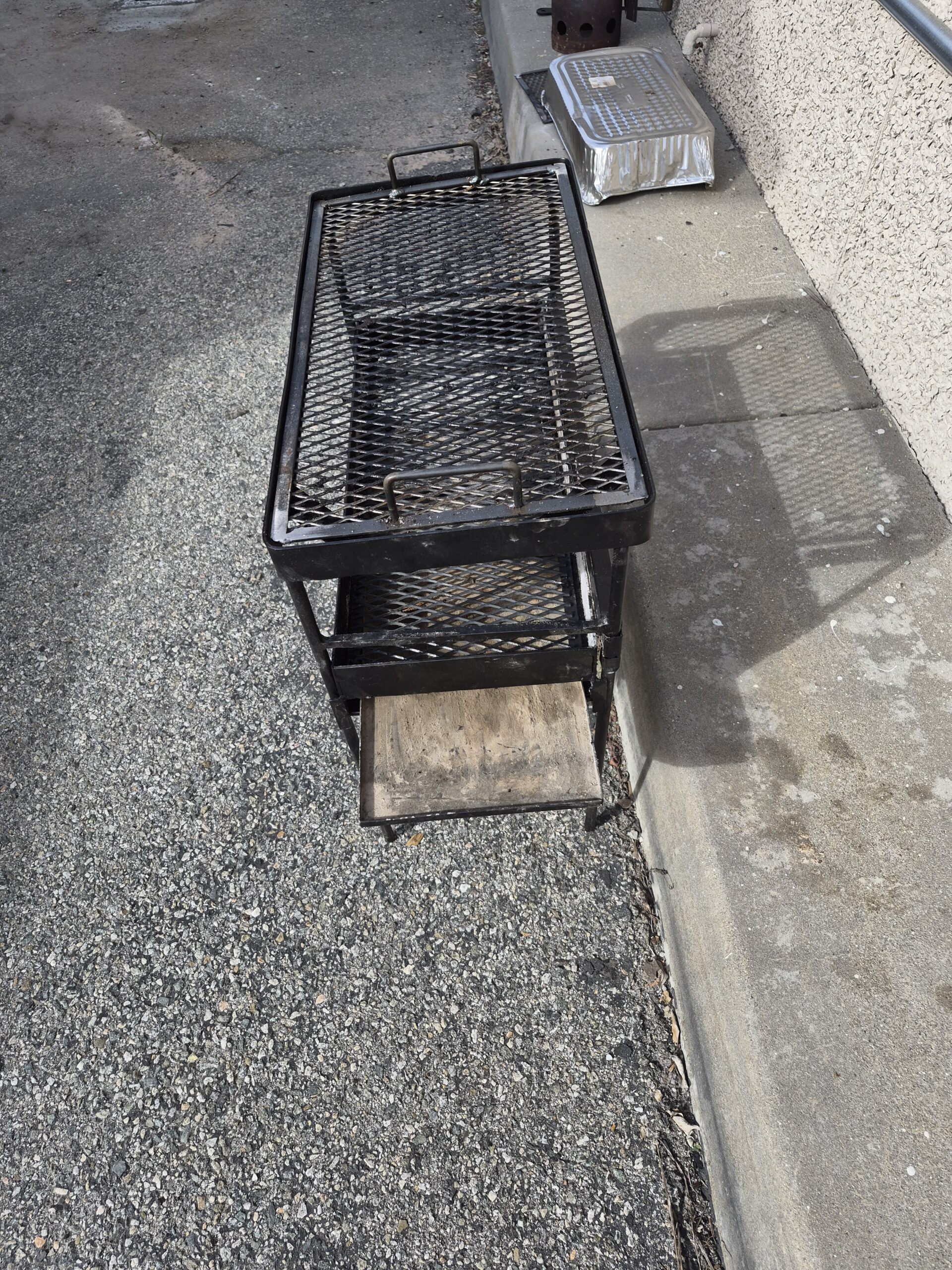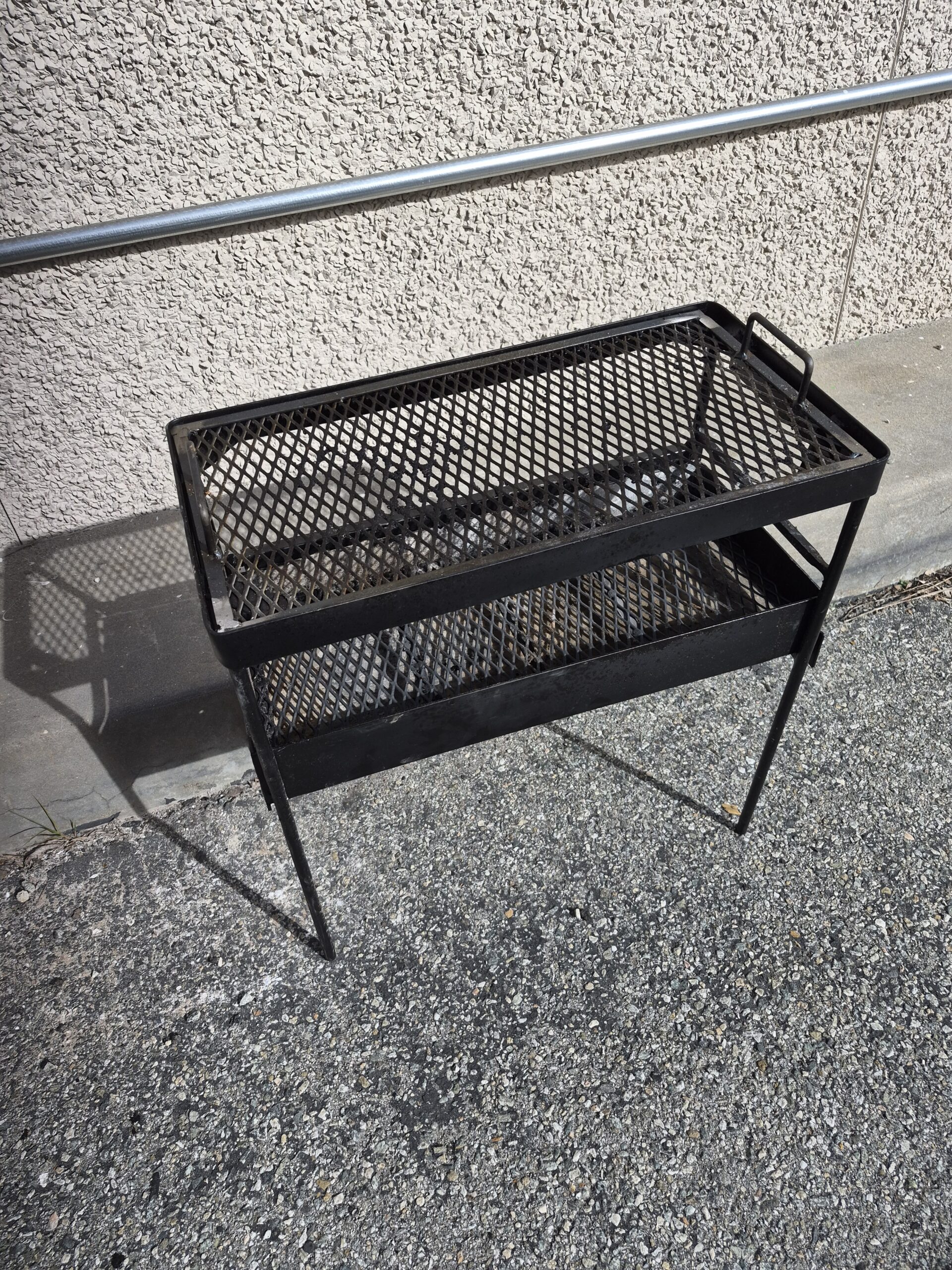 Camping grill measures 22 1/4″long x 11 3/4″wide x 22” high. The grill is good for regular grilling or grilling kabobs, and so much more. The legs fold flat into the grill frame. The grill comes with a bottom shelf to hold the coal or wood products that is adjustable to two different positions. The ash tray is integrated into the coal grate for easy cleanup of the ash. Setup takes minutes. There are two different settings for grilling, fast or slow. The framing and legs are made from solid steel, no tubing. One full grate and one-half grate as shown on the photos included. The grate mesh measurements are 1/2′ x 1” and 13 gauge thick. The grill is painted with high temperature paint. The two top grill grates are seasoned for better grilling. There is a lip around the edges so hot dogs or sausage don’t roll off the grate. The grilling grate and charcoal grate are removable and can be replaced.