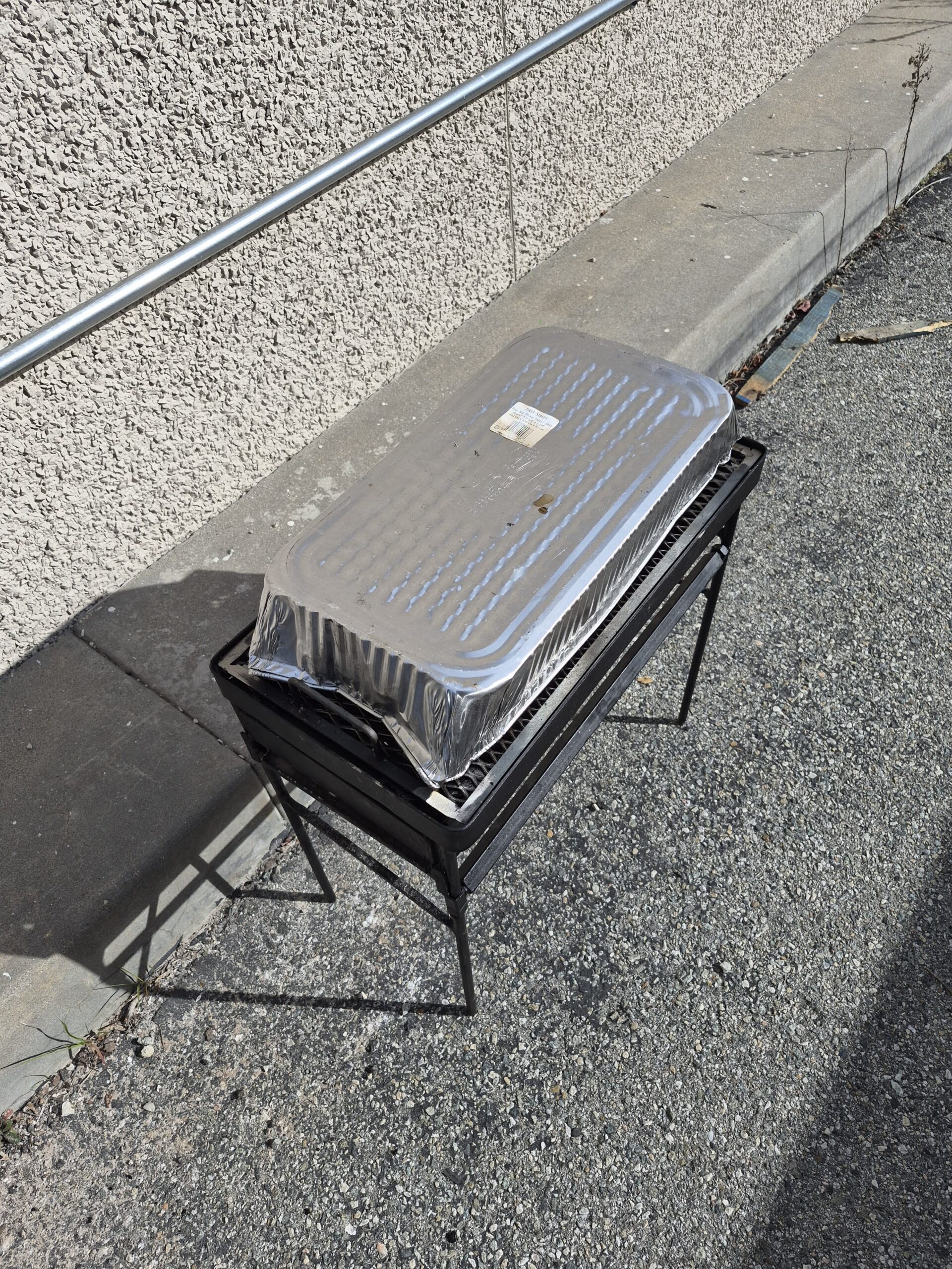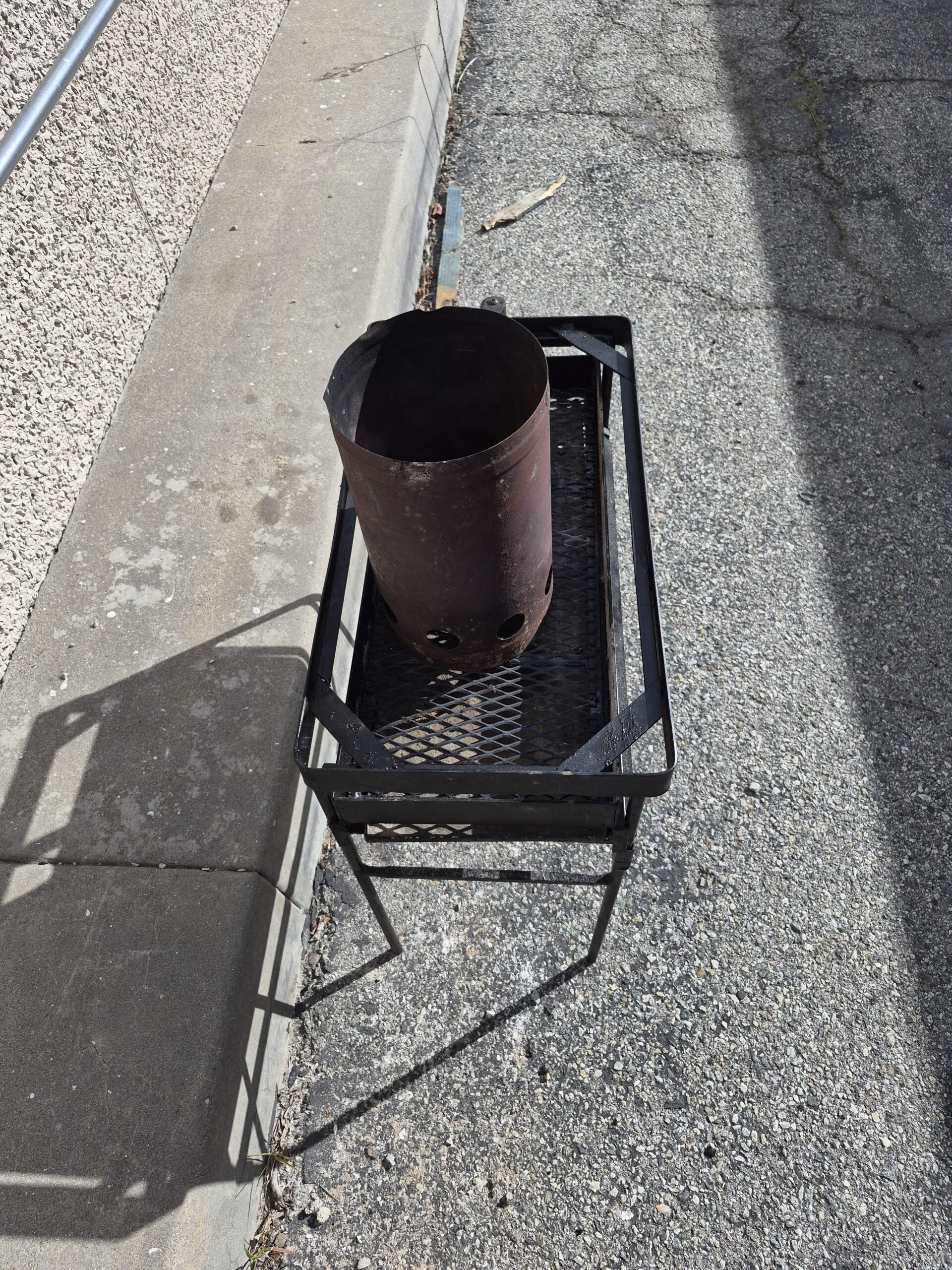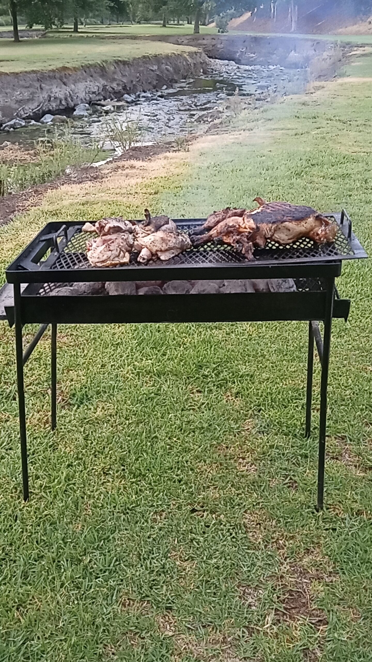 Camping grill measures 22 1/4″long x 11 3/4″wide x 22” high. The grill is good for regular grilling or grilling kabobs, and so much more. The legs fold flat into the grill frame. The grill comes with a bottom shelf to hold the coal or wood products that is adjustable to two different positions. The ash tray is integrated into the coal grate for easy cleanup of the ash. Setup takes minutes. There are two different settings for grilling, fast or slow. The framing and legs are made from solid steel, no tubing. One full grate and one-half grate as shown on the photos included. The grate mesh measurements are 1/2′ x 1” and 13 gauge thick. The grill is painted with high temperature paint. The two top grill grates are seasoned for better grilling. There is a lip around the edges so hot dogs or sausage don’t roll off the grate. The grilling grate and charcoal grate are removable and can be replaced.